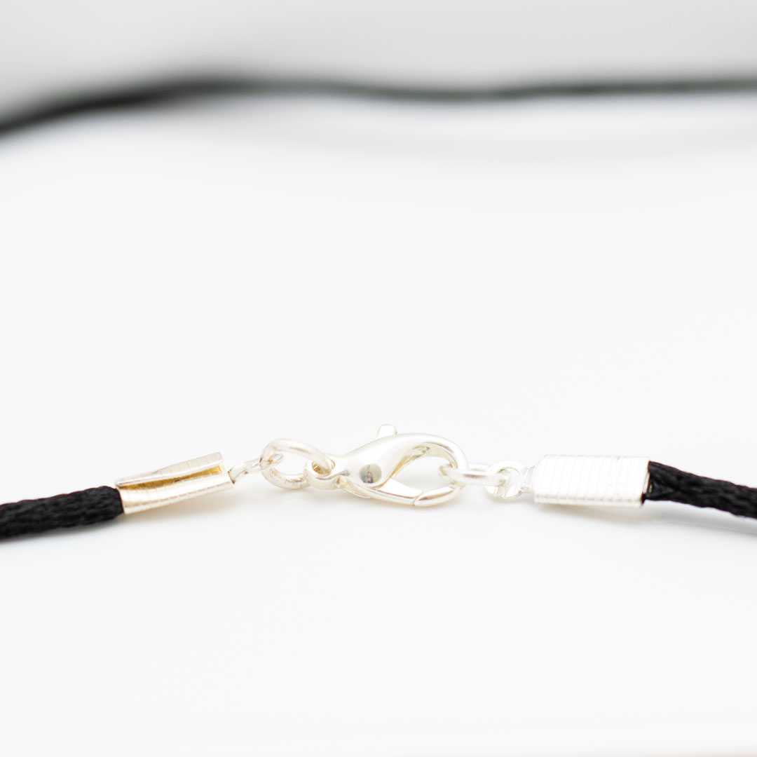 Här har du halsband med ett hänge av silverringar. De hänger i likadana svarta sidenband och båda har silverfärgat klolås. Halsbandet är 47 cm långt inkl. låset. Hängena är gjorda av ringar som är sammanlänkade så att de liknar en ros.