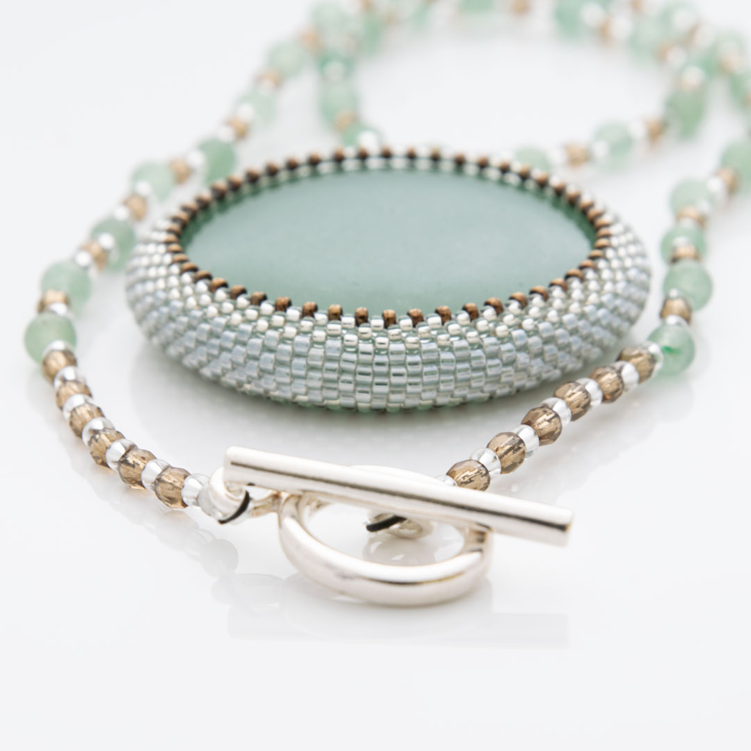 Halsband Aventurin har en stor slipad platta av aventurin som hängsmycke. Runt aventurinen har jag sytt en ram av mycket små silverfärgade pärlor och närmast stenen små guldbruna pärlor. Halsbandet består av 4 mm stora runda aventurinstenar, 3 mm stora smoked topaz-färgade fire polish och silverfärgade seed beads. Låset är ett stavlås i sterlingsilver.