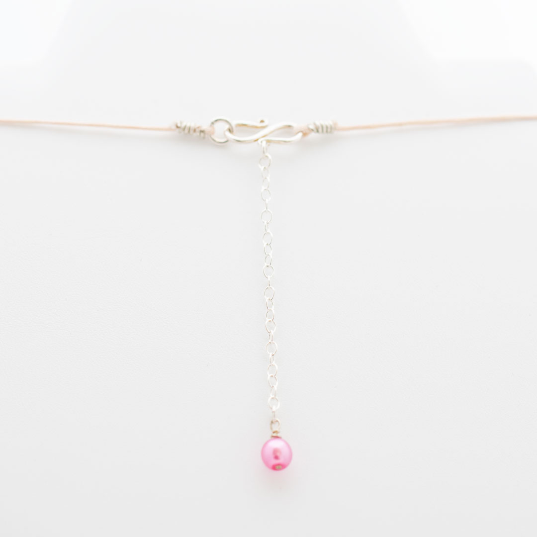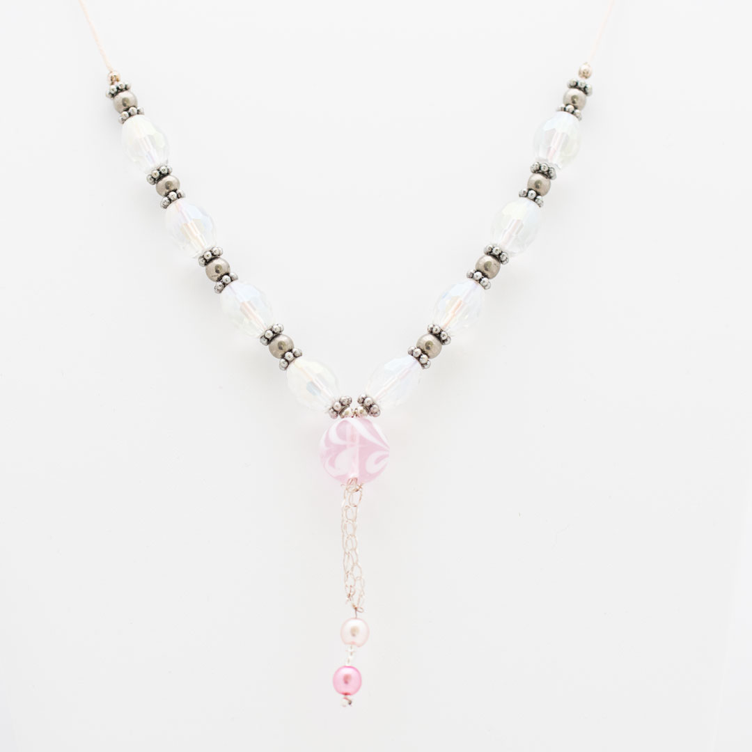 Det här halsbandet består av flera olika delar som alla samspelar med varandra på ett vackert sätt. Alla pärlor är glaspärlor och hela halsbandet går i en rosa ton. Låset är ett S-lås i sterlingsilver. I det hänger en silverfärgad förlängningskedja med en cerice vaxad glaspärla längst ut som en snygg detalj i nacken. I låset hänger också en svagt rosafärgad vaxad bomullstråd. I den tråden hänger 8 stycken (4 på var sida) 13 mm långa facetterade glaspärlor samt metallfärgade glaspärlor ner mot en 14 mm stor rosa glaspärla med vita blomblad. Från den stora pärlan hänger sedan en dubbel virkad silvertråd och i slutet av den tråden hänger en ljusrosa och en cerice vaxad glaspärla med 3 silverfärgade seed beads emellan.