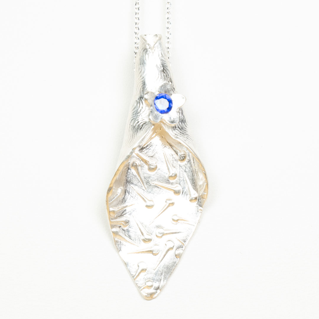Detta helt originella hängsmycke är gjort i finsilver. Det är olika mönster på framsidan och på baksidan. Framsidan har ett mönster av spikar och baksidan är lätt randigt i ett vågmönster. Den blå blomman mitt fram är en blå cubic zirkonia som är 4 mm i diameter. Kedja ingår ej men du kan använda både en tunn eller lite tjockare silverkedja eller ett organzaband eller mockaband/skinnband i någon färg som förslagsvis passar ihop med den blå färgen på blomman.