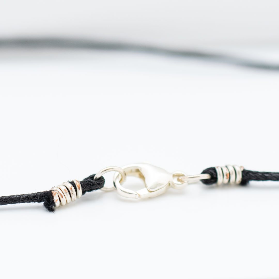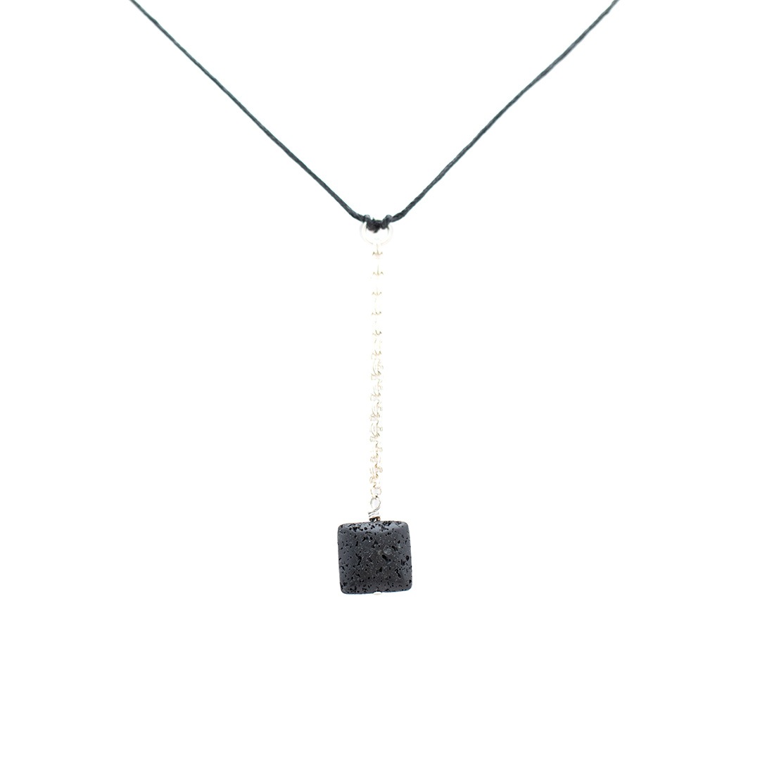 Här är ett halsband i svart och silver. Den fyrkantiga platta lavastenen hänger i en kedja av ringar av sterlingsilver. Dessa i sin tur hänger i ett svart läderband. Låset är ett klolås av sterlingsilver. Halsbandets totala längd inkl. låset är 52 cm. Hänget (silverkedjan + lavastenen) är 8,8 cm.