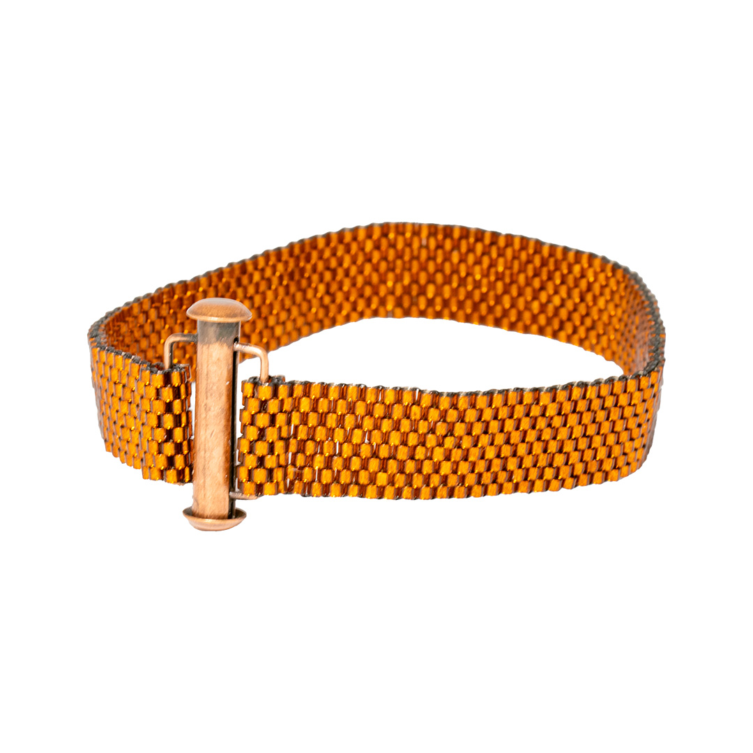 Detta pärlarmband passar för alla tillfällen. Vill du vara extra fin eller bara ha ett enkelt armband till vardags? Armbandet består av små Miyuki-pärlor som är som små tuber. Mönstret de är sydda i heter peyote och det ser ut som om pärlorna sitter som tegelstenar i en tegelmur eller -vägg. Låset är ett kopparfärgat tublås som du öppnar genom att dra isär ändarna.