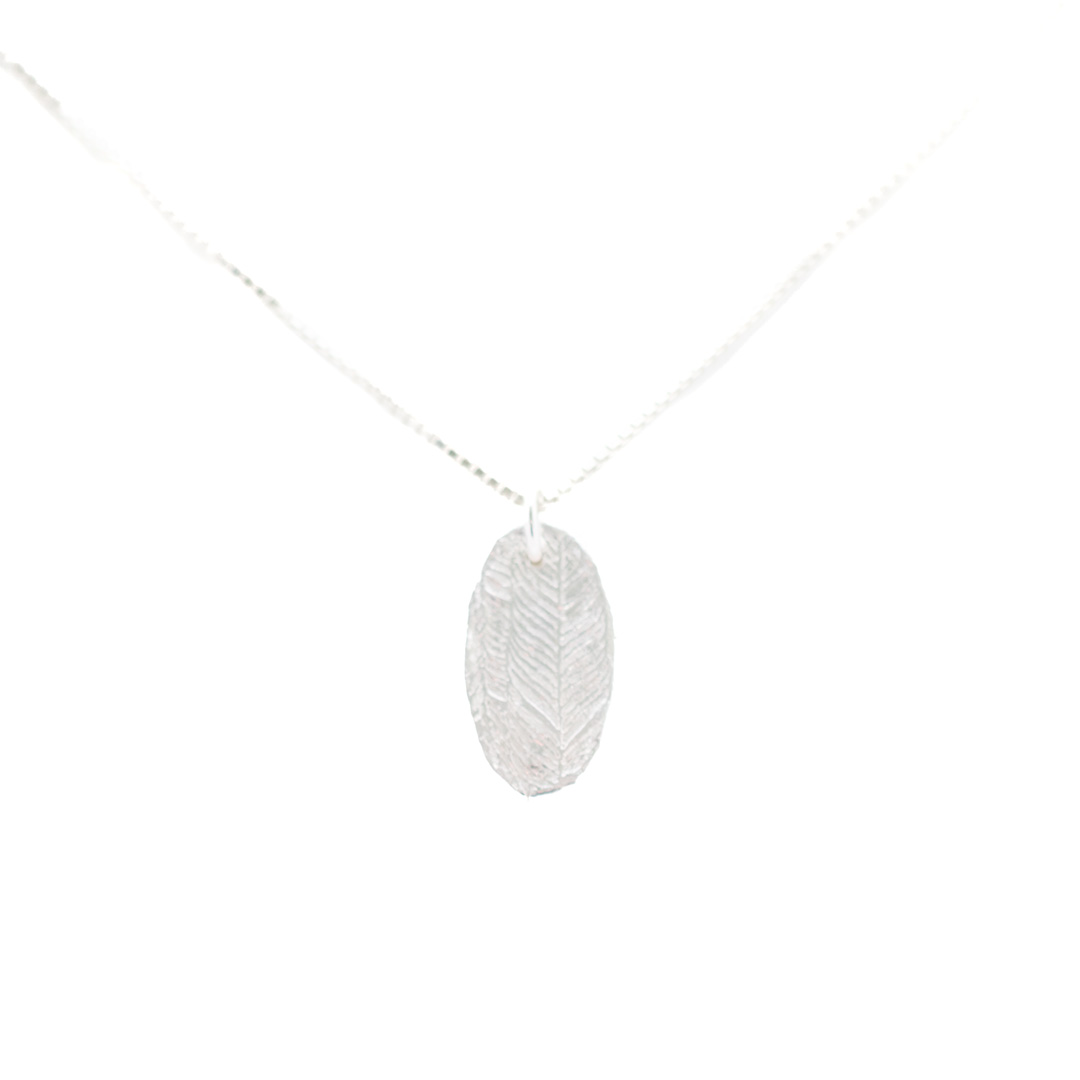 Detta silverhalsband har ett hänge av finsilver som är mönstrat som en fjäder. Hänget är 2 cm långt, 1,1 cm brett och 2 mm tjockt. Halskedjan är en venecia-kedja som är 1 mm tjock och 50 cm lång. Låset är ett springlås. Både kedjan och låset är sterlingsilver. Halsbandet väger 5 gram så det är inte tungt att bära.