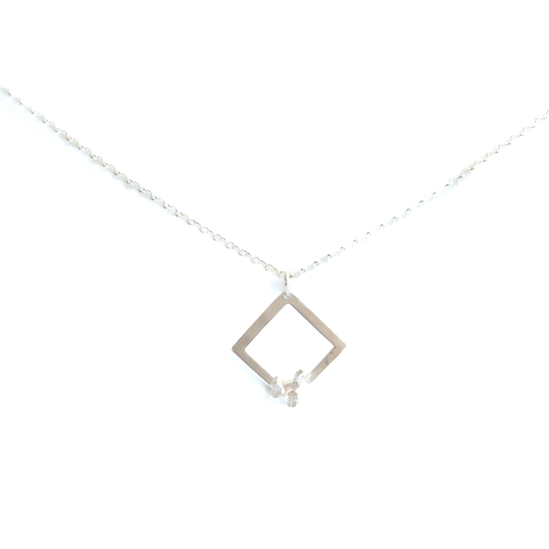 Silverhalsband Unique Square är gjort av återvunnet sterlingsilver och formationen som pryder fyrkanten är gjort genom organisk silvergjutning. Det här smycket är omöjligt att kopiera. Eftersom det är så luftigt är det inte svårt att hitta användningsområden för detta halsband. Det passar lika bra på festen som på jobbet.