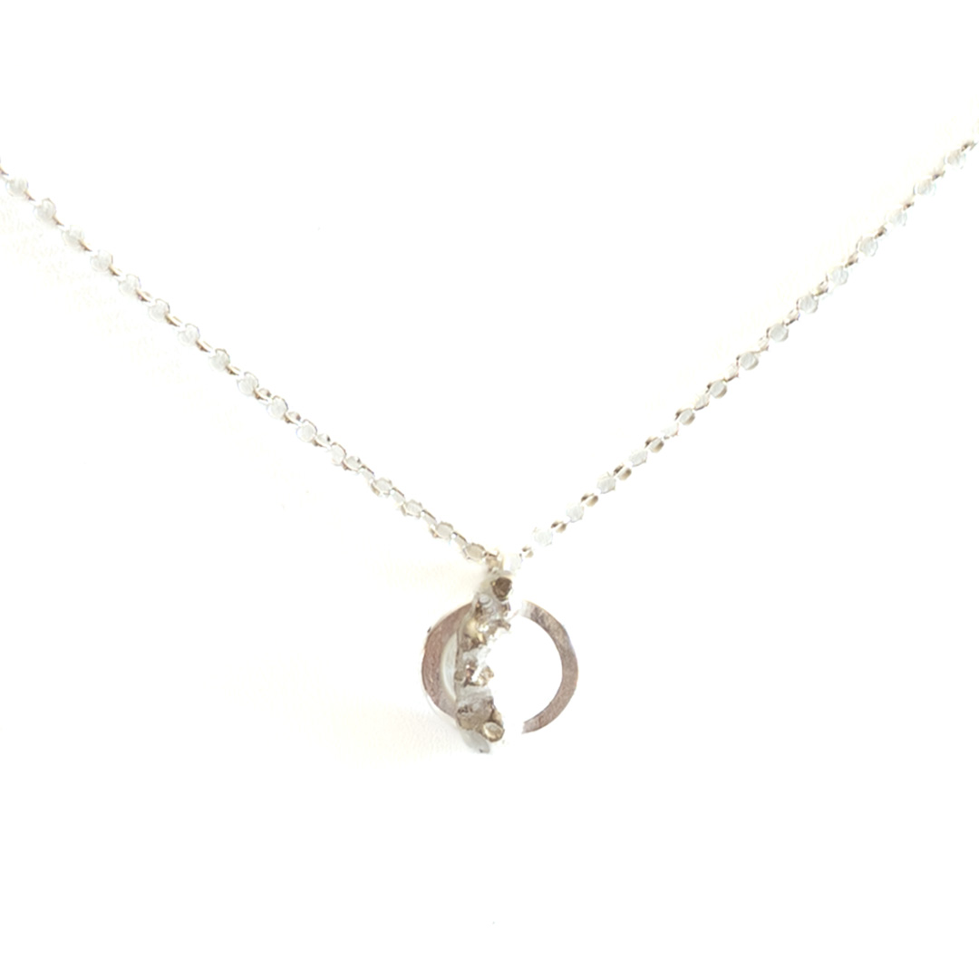 Silverhalsband Utanför är ett halsband av återvunnet sterlingsilver. Detaljen på hängets framsida är gjort i organisk silvergjutning och är omöjlig att kopiera. Den är sedan fastlödd på en platt ring av sterlingsilver. Det här är ett halsband som du kan använda både på festen och på jobbet.