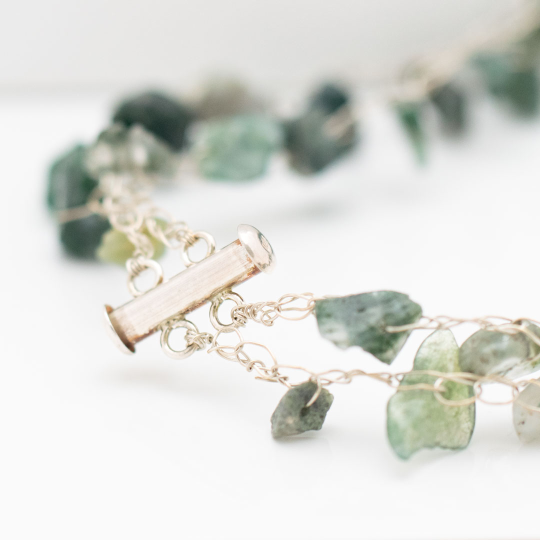 Det här är ett mycket elegant halsband av virkad 0,3 mm tunn finsilvertråd och halvädelstenar grön aventurin. Det är tvåradigt och ser fylligt ut på halsen. Låset är ett tublås för tvåradiga halsband. Halsbandets totala längd är 52 cm och stenarna sitter med ca 1 cm mellanrum.
